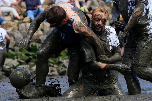 The events include mud versions of traditional sports like soccer and handball, as well as mud specific events like the mud-eel race and the long-distance rubber boot toss.